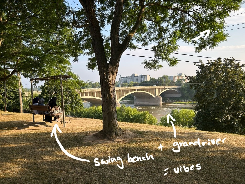 That evening, we followed the trail until it opened up by the water. Brantford has these benches that swing, just lightly, with their backs to the traffic and their faces to the Grand River. We sat for a while, letting it rock beneath us. The sun was setting. People passed in pairs. It felt like a town trying to make space for rest.